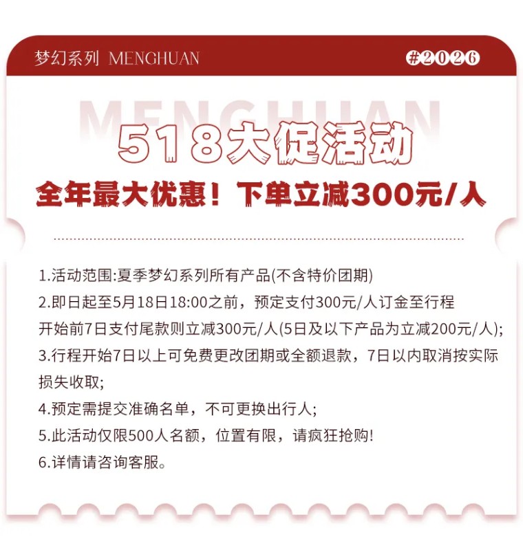 优惠团期:4月29日-5月4日、5月29日-6月25日、9月1日-9月24日