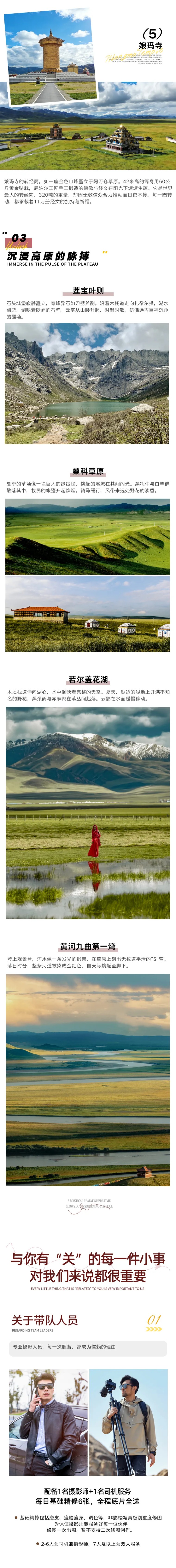 摄影师:当期满7人安排1名摄影师全程单反摄影,不足人数为司机兼摄影师(出行前两天发出行短信,景区内司机无法陪同游玩),为保证每位客人的照片张数及质量,摄影师会进景区进行拍摄,以每个人都出片为目的,但是并非专业导游不提供讲解及全程陪玩服务,望悉知。