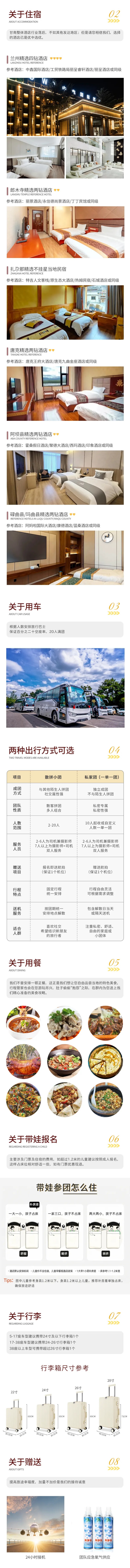 1、住宿:兰州4钻酒店标间1晚、郎木寺镇2钻酒店标间1晚、扎尕那藏式民宿标间1晚、唐克县2钻酒店标间1晚、阿坝县2钻酒店标间1晚、玛曲县/碌曲县2钻酒店标间1晚