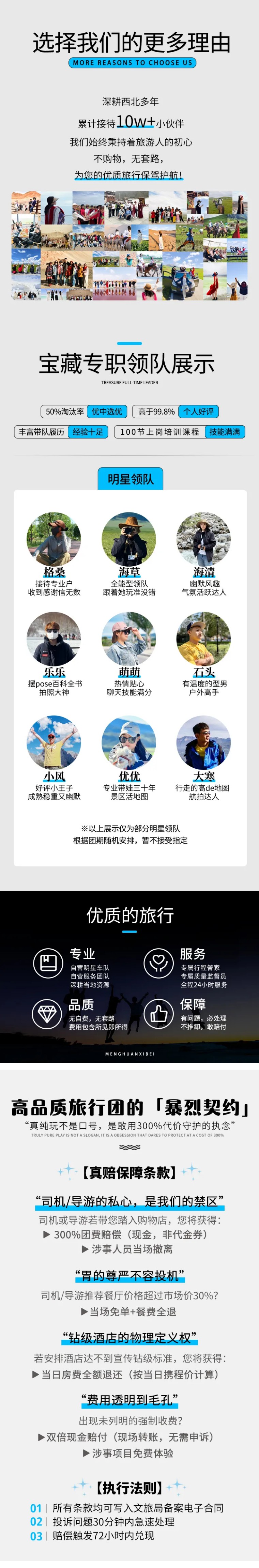 12、行程中司机、领队等工作人员拍摄的照片或者视频有可能会用于我司宣传线路之用,无其他用途;如您介意可联系我司第一时间删除,保证您的权益。