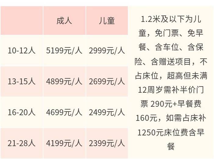 · 1.2米及以下为儿童,不占床位(与成人共用1张床铺)、免门票、免早餐、含车位、含司机服务、含保险、含赠送项目;
