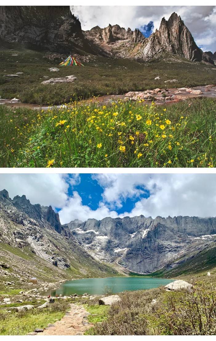 09:00抵达【莲宝叶则】,这里是藏区著名的神山,挺拨的千刃石峰是其雄伟的风骨,晶莹闪亮的湖泊是她宝石般多情的眼睛。世上的行者分两种,一种是来过莲宝叶则的,另一种是正在赶来途中的。与年保玉则同属巴颜喀拉山脉,一个在青一个在川。我们来到这片秘境中的秘境,朝拜这安多地区神山之首。