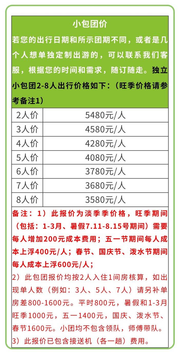③暑假旺季、版纳旺季(1-3月),成人:3680元/人,儿童:2000元/人;单房差1000元;