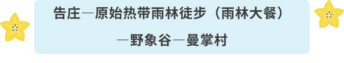 车程:告庄—原始热带雨林,100KM,约1.5小时;热带雨林—野象谷—曼掌,130KM,约2小时;