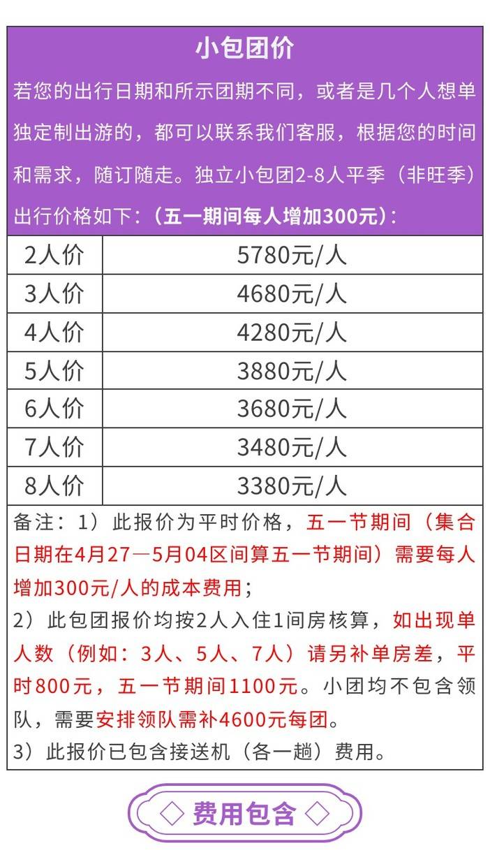 5.【单人房差】平常800元/人,第3期1000元/人,五一节1100元/人(行程住宿按照双人标准间安排,单人报名拼房不成,单房差由我司承担,如队员个人要求单住则需补齐房差!)