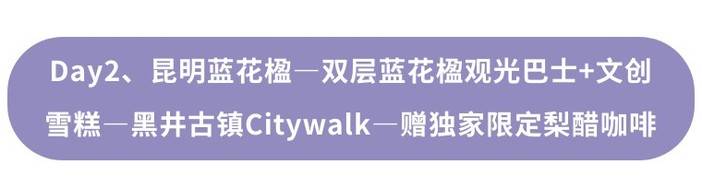 【旅行体验】:特别安排昆明双层蓝花楹环线观光巴士票+每人网红一支蓝花楹雪糕打卡拍照+黑井盐都限定梨醋咖啡一杯+99里网红温泉票+泸沽湖篝火晚会+泸沽湖服装cos