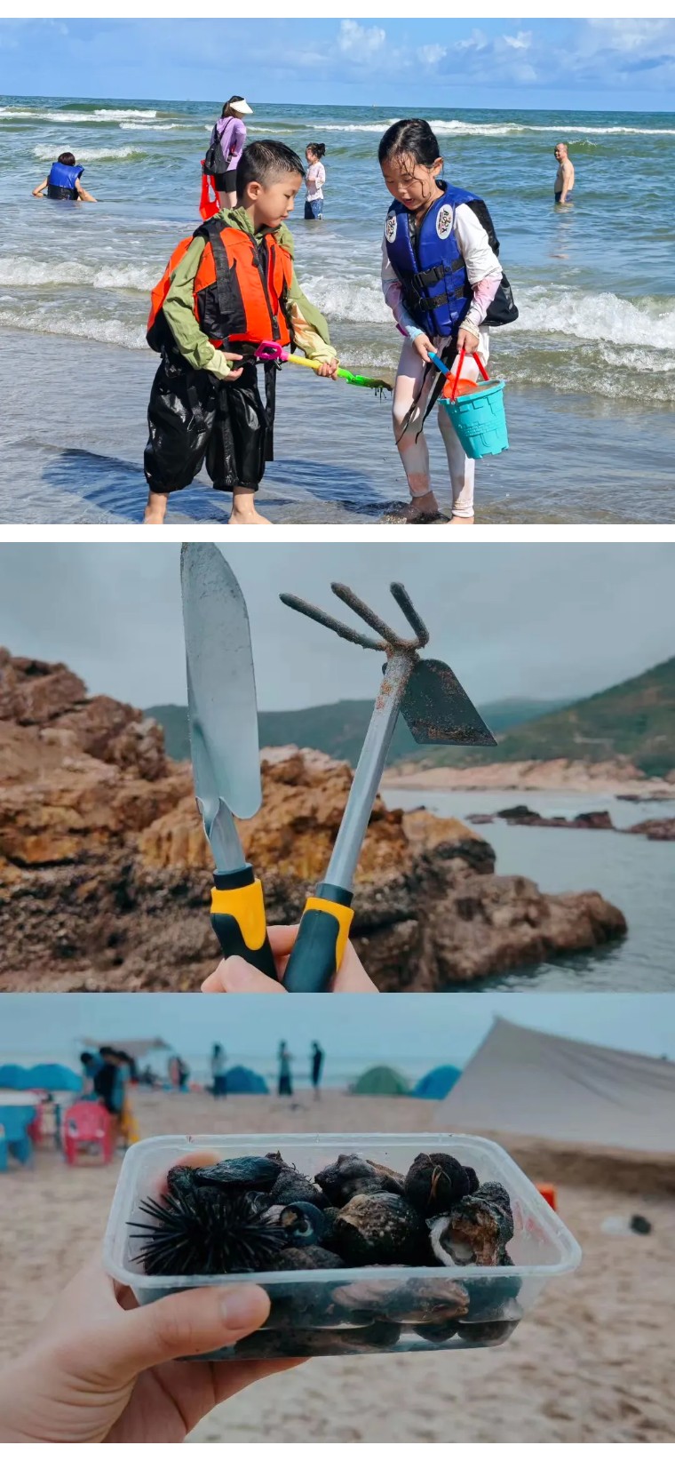 3、赠送赶海体验的器材使用:水桶、小铲子、小耙子、蟹笼(数量有限,轮流玩)