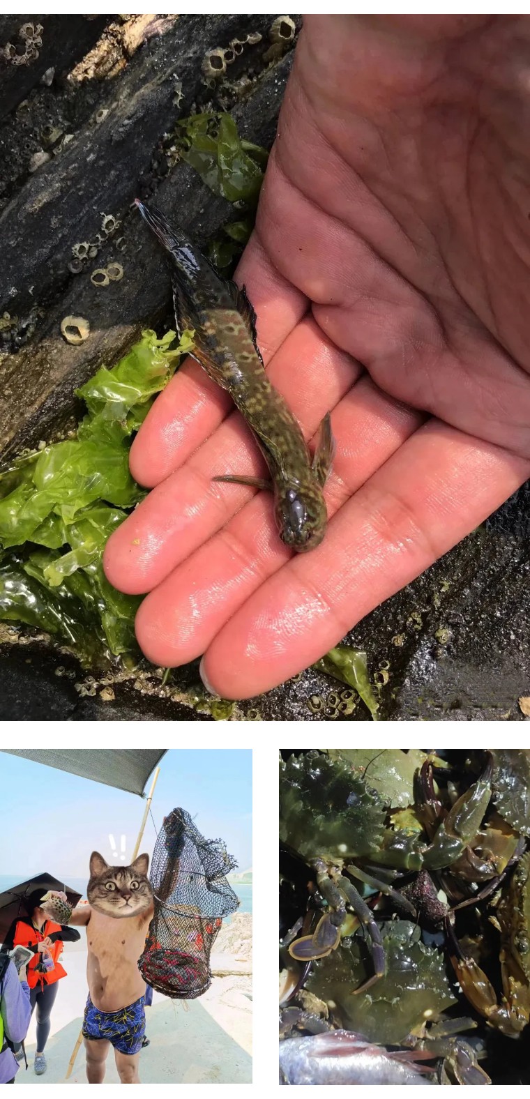 这个由于未经开发,海货非常多,在礁石边就很容易弄到一些石鳖、将军帽、海虹、生蚝、牛角螺、猫眼螺、八爪螺、佛手、沙白、花甲、青口、猪仔螺、苦螺、螃蟹、藤壶等等。