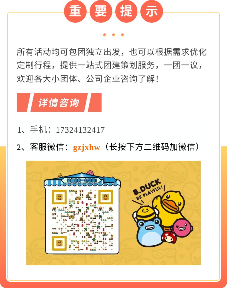每周末固定组织周边1~5日游活动,可为各大小企业、家庭提供定制团建/旅游方案,提供正规合同及发票,欢迎来电咨询!