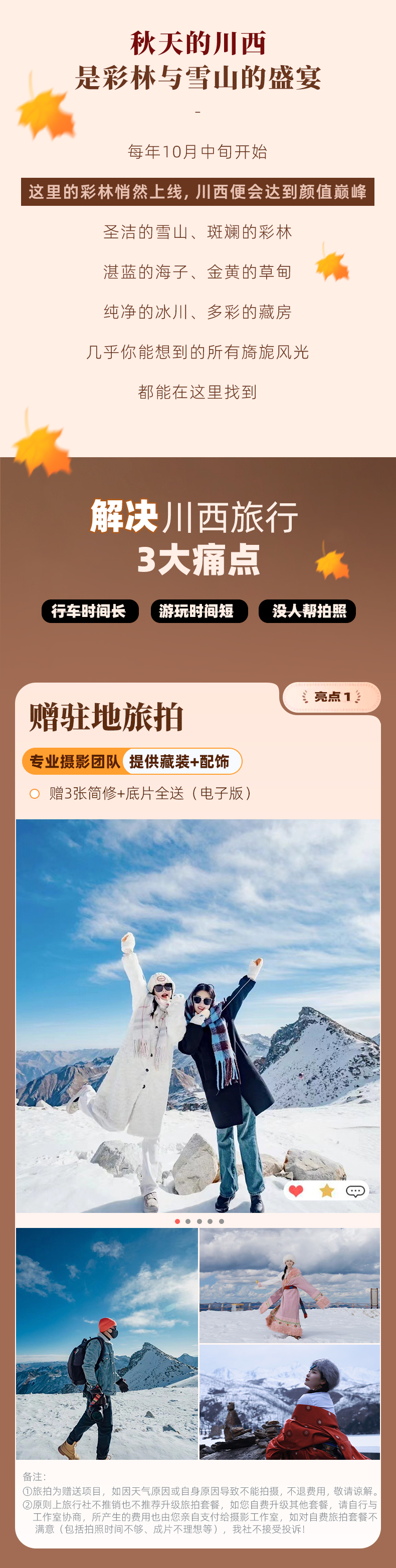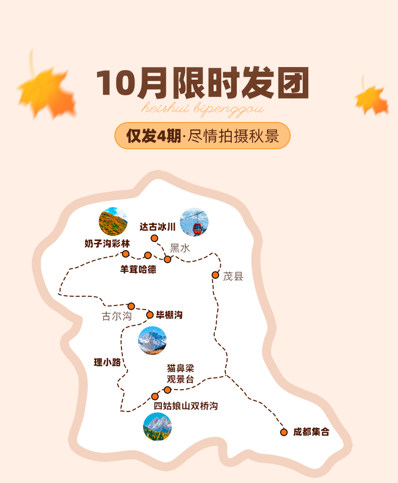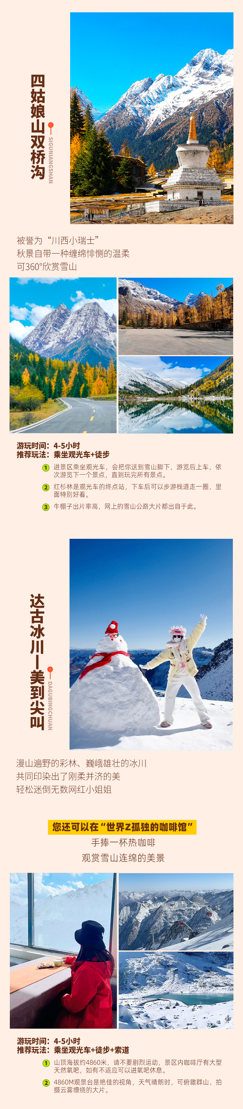 【行程概述】早餐后乘车前往“东方阿尔卑斯山”--四姑娘山,沿途观赏川西秋色,随后抵达【四姑娘山双桥沟】换乘观光车(景区观光车70元/人,费用自理)游览,沟内两面皆是山,却山山不同,沟内处处皆景,而景景有别,真可谓“横看成岭侧成峰,远近高低各不同”。在长达40余公里的沟内,雪山比比皆是,从画屏口的【锅庄山】到【撵鱼坝】的犀牛望月、企鹅嘴、尖刀山等等,依次排列了十几座海拨4000多米以上的雪山。一路往里面走,前后左右,雪山尽入眼底,站在沟谷任何一处地方,均可360°无死角欣赏雪山。每到秋季,低山地带常见的成片桦木林、柏杨林、青枫林,高山地带的云杉、冷杉、红杉还有成片的沙棘、灌木、落叶松,全都被染上了颜色,黄色、红色、橙色......到处都是层林尽染的彩林。游览后乘车离开,沿途可在【猫鼻梁】拍摄【四姑娘山】全貌,随后经巴郎山、卧龙镇、映秀镇返回成都散团。