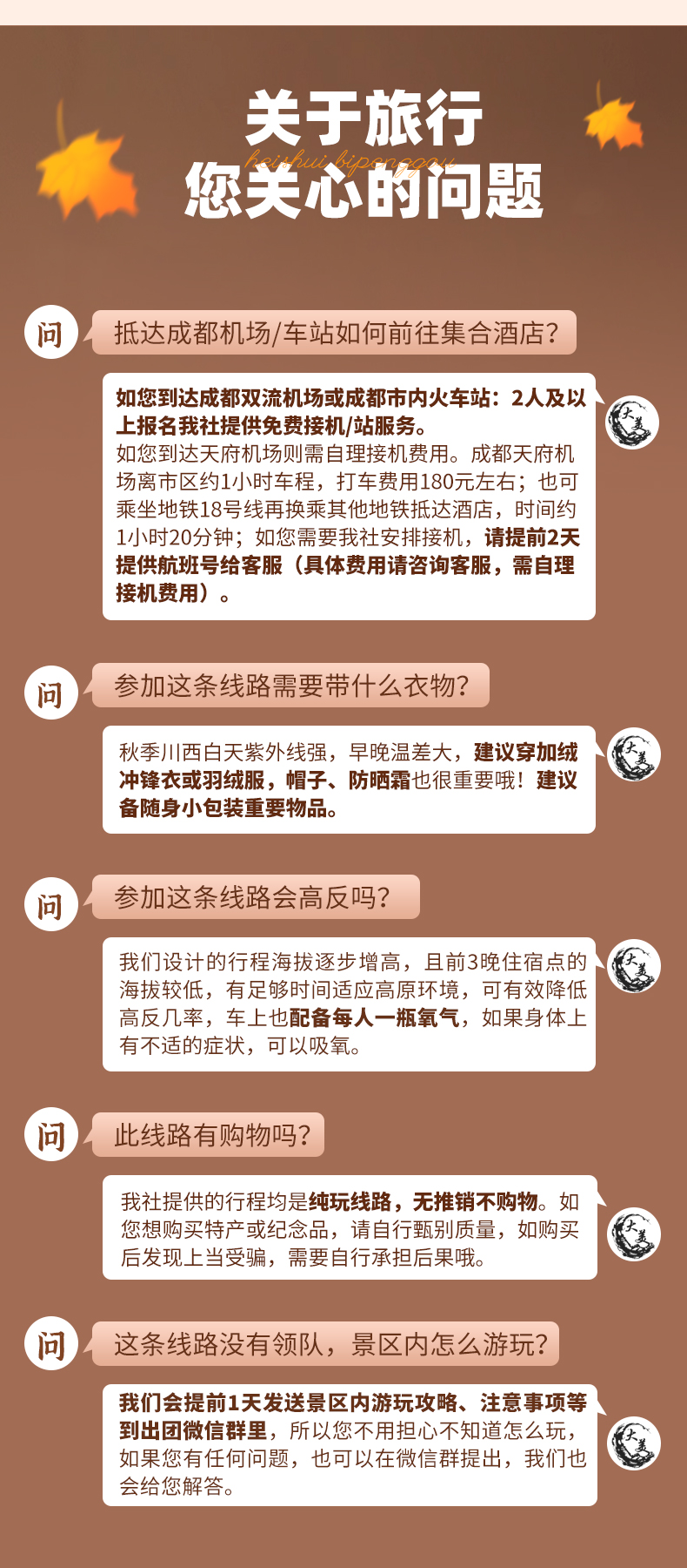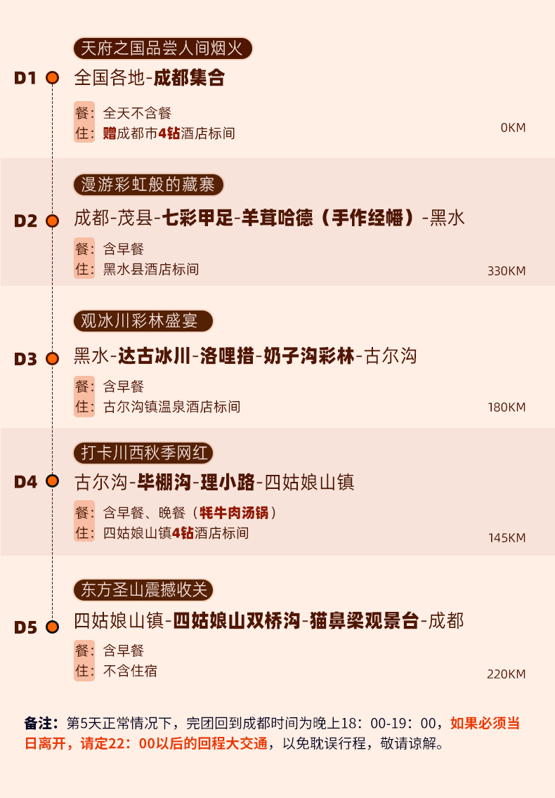 (1)以上行程时间安排可能会因天气、路况等原因做相应调整,正常情况下完团回到成都的时间为晚上18:00-19:00,散团点距离成都双流机场约30分钟车程,距离天府机场约1小时车程,建议预定次日离开成都的大交通,如果必须当日离开,请定22:00以后双流机场起飞的回程大交通,以免耽误行程,敬请谅解;