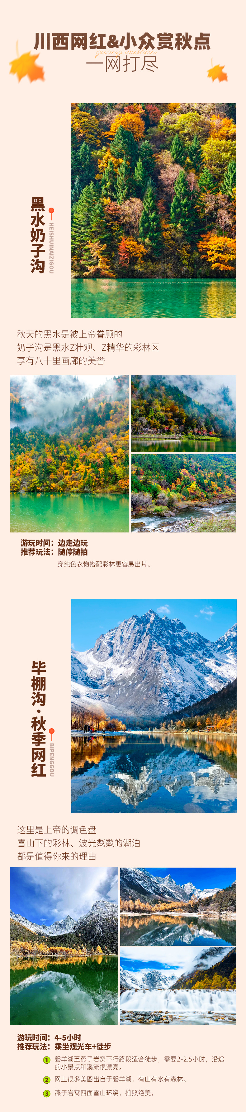 【行程概述】早餐后乘车前往【毕棚沟】游览,毕棚沟有着“小九寨”的美誉,每到10-11月,枫树、桦树、鹅掌松、落叶松等都被染成绚丽的鲜红色和金黄色,俨然是一个五彩斑斓的世界。进入景区后,可以坐观光车(景区观光车70元/人,费用自理,必须乘坐)穿过原始森林到达【龙王海】、【娜姆湖】、【上海子】等,沿途可将沟内原始森林、漫山遍野的红叶、神圣雪山、林立奇峰、瀑布飞挂等美景尽收眼底。游览结束,沿着一路的秋景继续前行,经网上爆红的【理小路】,沿途观赏雪山、草原、河谷、彩林......一路边走边玩,晚上入住四姑娘山镇。