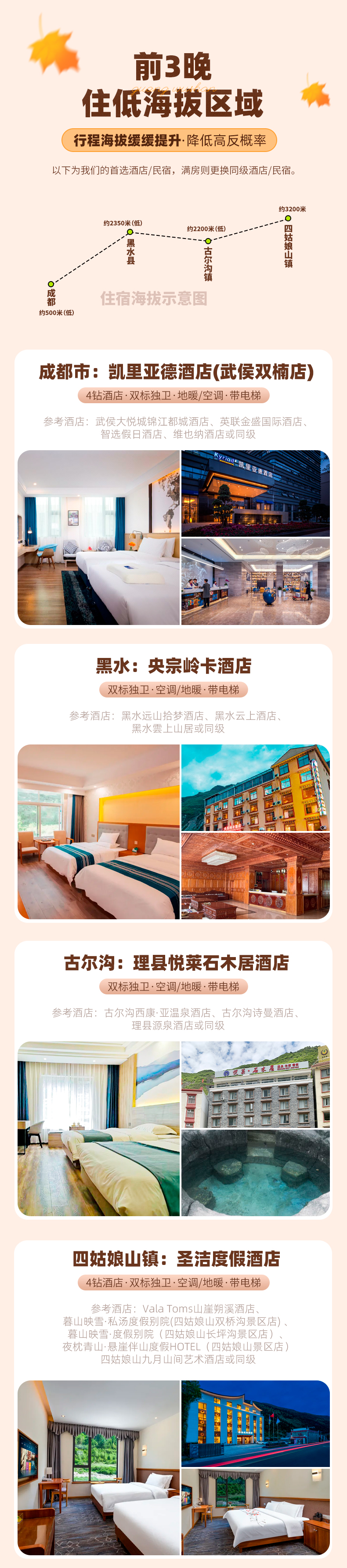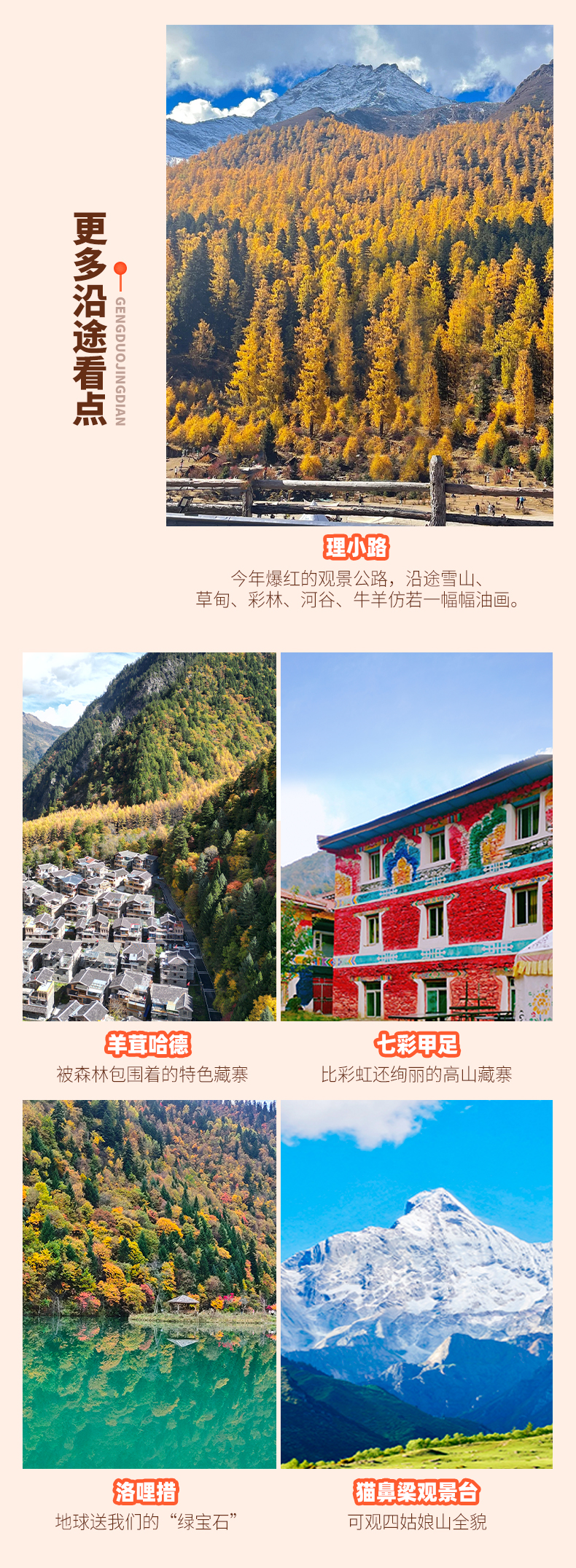 【行程概述】早餐后乘车前往【达古冰川】,达古冰川是全球海拔最低、面积最大、年纪最轻的冰川,这儿的秋天既有秋的绚丽,又有冬的纯净,宛若一个五彩斑斓的童话世界。我们从景区门口坐观光车(70元/人,费用自理,必须乘坐)到索道口的路上会遇见大大小小的湖,湖畔色彩斑斓的彩林倒映在湖面上,与湖底的颜色混合成了一个异彩纷呈的彩色世界,远处的雪山在阳光下,显得更加的雄伟壮观、如梦如幻。很快我们就能到达金丝猴经常出没的【金猴湖】,如果足够幸运,在这里能看到金丝猴,随后游览【红军湖】、【红军桥】、【神牛湖】,欣赏沿途的美景。后到达索道下站,也就是观光车终点站,从这里开始就是达古冰川的精华景点,10-11月红叶彩林漫山遍野,层林尽染,犹如一幅彩色油画。我们可以在索道下站坐索道直接上到山顶的冰川腹地,看连绵雪山冰川,观赏【一号冰川】,感受一览众山小,俯视一切的雄壮气概。还可以在世界上海拔最高的咖啡馆,同时也被称为【世界上最孤独的咖啡馆】,喝上一杯咖啡,饱览美景。看过冰山下的秋景,车继续前行,沿途会经过一个叫【洛哩措】的地方,这里像是一块地球送给我们的绿宝石,波光粼粼、彩林漫漫,连掠过的风,都是自由的。随后来到黑水最为壮观的【奶子沟彩林区】。秋天的黑水是被上帝眷顾的,湛蓝的天空,纯净的雪山,漫山遍野的彩林,上帝仿佛在这弄撒了调色板,将黑水描绘得五彩斑斓。而在黑水最有名的还是那有着【八十里画廊】的奶子沟,这里是彩林的世界,在雄奇的冰川下、美丽的雪山上、独特的藏寨边、婉蜒河流旁均有成片的彩林分布,是亚洲最大的天然彩林,享有八十里画廊的美誉。游览后经鹧鸪山隧道、米亚罗镇,前往【古尔沟】镇入住,晚上可以泡泡温泉,放松放松。