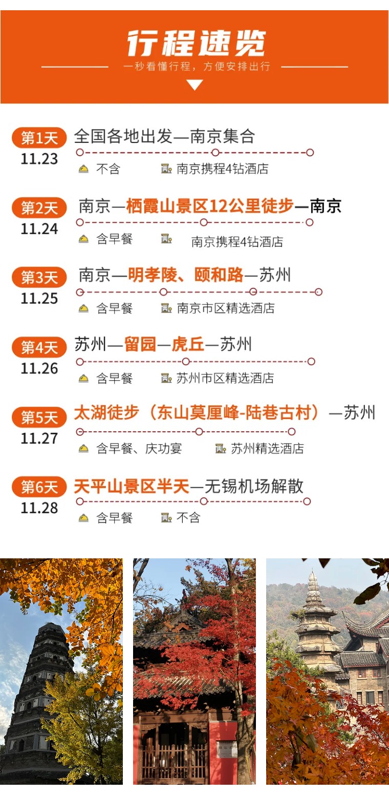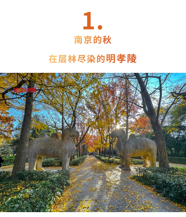 早起早餐后我们乘车出发【明孝陵】,我们常说“秋栖霞”应该分一半的盛名给明孝陵。我们将走进金黄火红的浪漫之路,走进石象路,在茫茫林海中,就如同走进了一条时光隧道,金黄的,火红的,交织出历史的幻像。神道可分为两段,石像路是南段,这一段神道两侧的石像是六种动物,从神功盛碑亭过来,由南往北分别是狮、獬豸、橐驼、象、麒麟、马,每种又各有一对蹲伏,一对直立,共十二对。我们的领队带领寻找私藏的绝美秋色。适时集合,尽量避开来自中山东路的拥堵,大家不妨跟着领队一起乘坐南京地铁(不堵车则乘大巴前往),一起去品南京科巷美食,好吃不贵,便宜实惠,宝藏美食街。饱餐后,继续乘车前往颐和路。“一条颐和路,半部民国史”。颐和路,拥有200多栋民国建筑,被誉为“民国建筑博物馆”。民国之于南京,是一段浓墨重彩的岁月,顾和路几乎见证了整个民国的风起云涌。我们漫步颐和路,体验这份金陵城独特的浪漫秋色。
