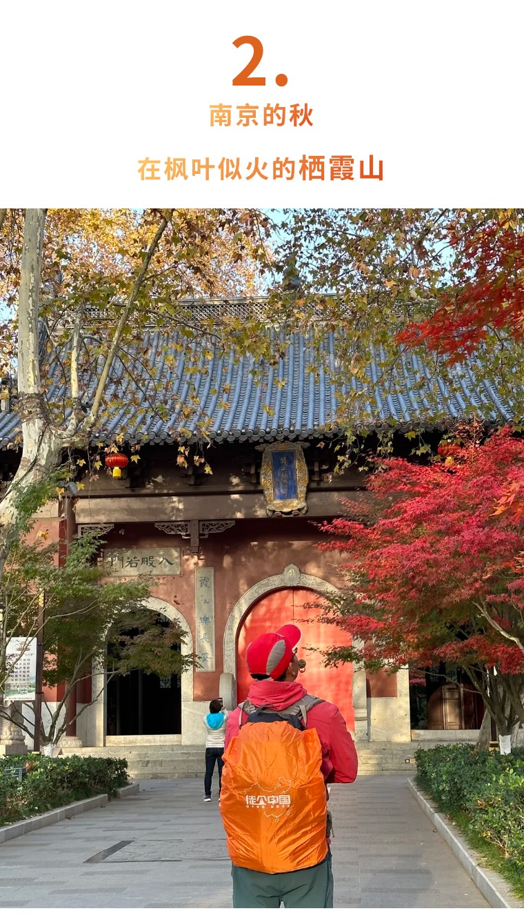 路线:栖霞寺——红叶谷——枫林湖——始皇临江——凤翔峰(主峰海拔286米)——太虚亭——(小营盘)——舍利塔——明镜湖。