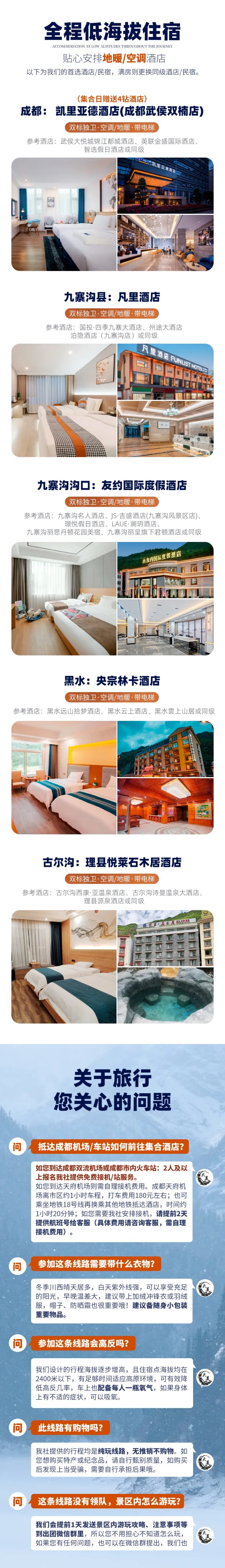 (2)到集合酒店报“大美九寨+姓名”拿房,房费已付,押金自付。入住酒店的时间一般在集合日当天的14点以后,如果您提前到达且酒店房间未整理出来无法办理入住,可将行李暂时寄存在前台,先在市区周边自由游玩;