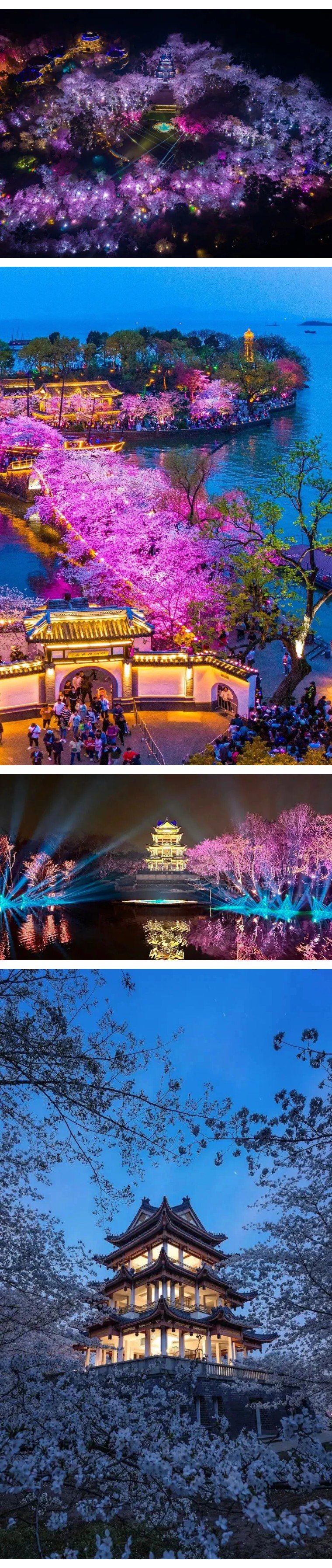 华灯初上,鼋头渚的夜晚格外迷人。在樱花树下穿梭,看着这些樱花,享受着浪漫樱花带来的视觉盛宴!夜色为樱花镀上滤镜,光影交错。白日的喧嚣褪去,只剩花瓣与星光的私语!随风飘落的花瓣点缀着夜晚的天空,像极了冬日里的皑皑白雪。樱花雨中漫步,别有一番趣味。这是樱花留给春天最后的浪漫,不负春光,总要在春天邂逅一场樱花雨吧!