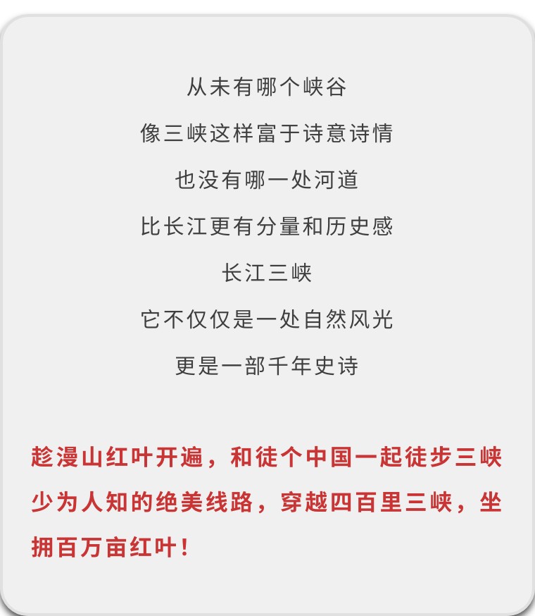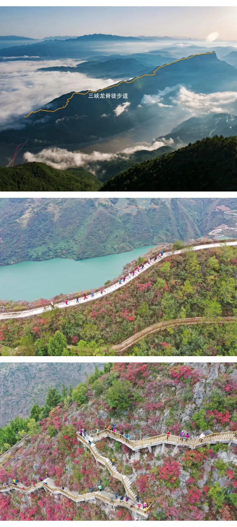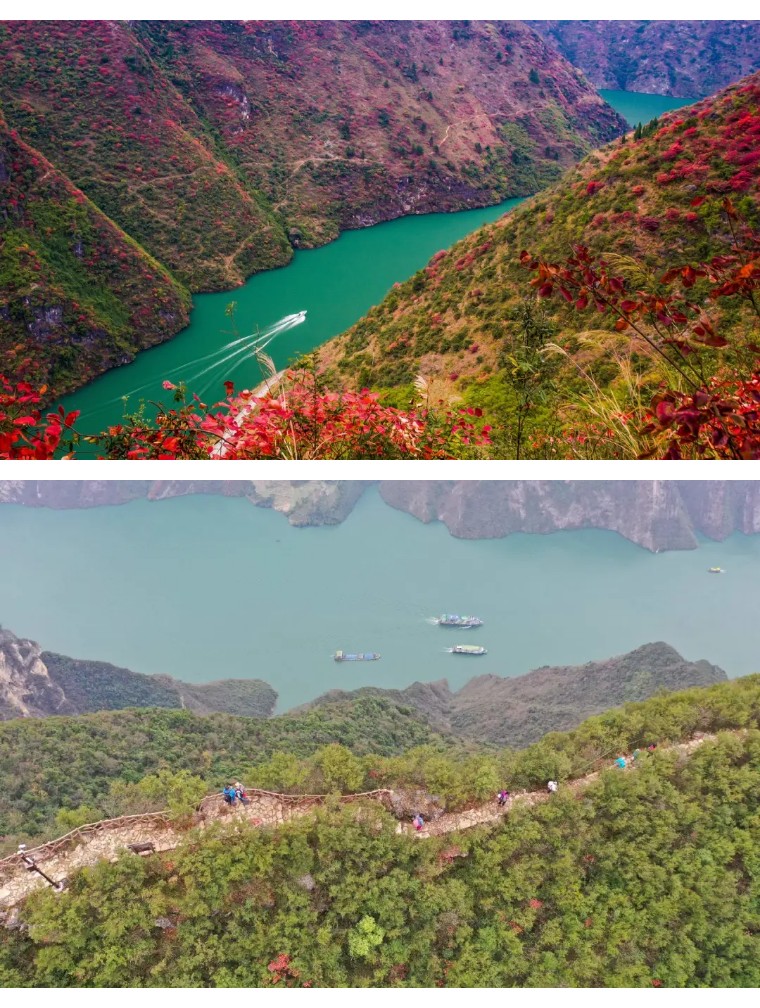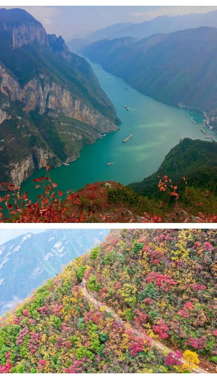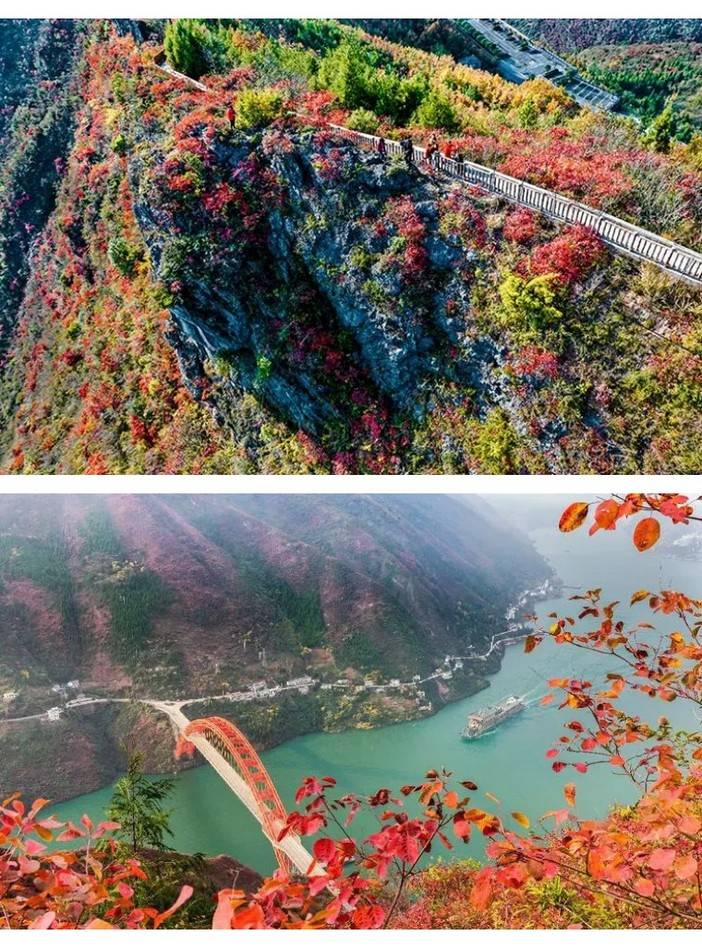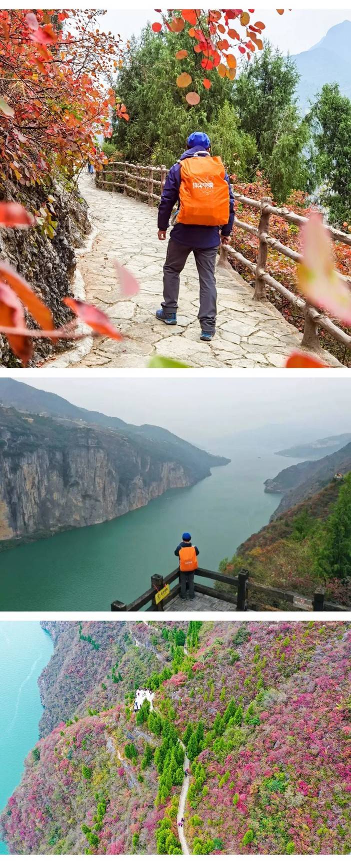 从景区入口穿越古栈道登顶鹰嘴岩一路红叶相伴,美不胜收俯视巫峡奇景,炫彩壮阔被驴友评为“长江上最美的三峡画廊”。