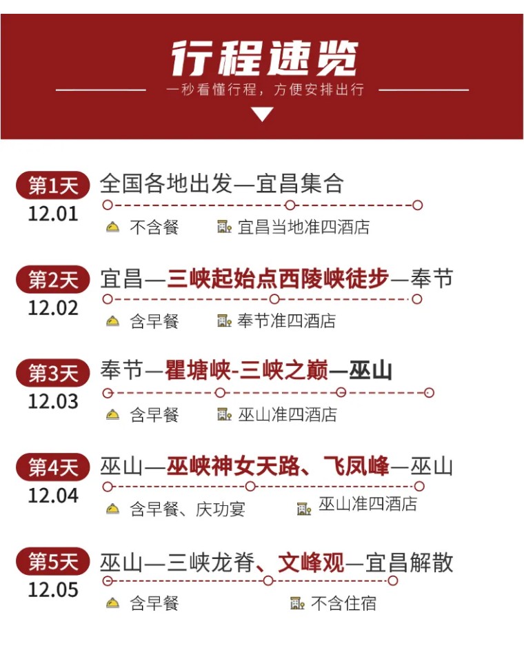 3、门票:三峡之巅门票+索道,白帝城景区门票+渡船,巫山-青石信号台渡轮般票,三游洞门票;
