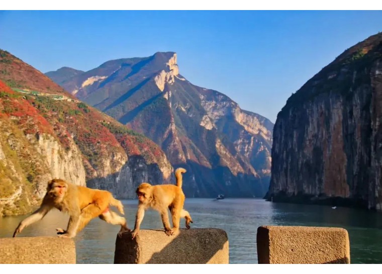 在前往江边白帝城后山沿途会碰到很多野猴子,在瑰丽山水间前行,两岸传来野猴的叫声,终于体会到李白当年在此写下“两岸猿声啼不住”的真实感。