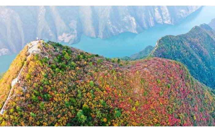 文峰观多走一段路。约2-3公里。有一段最美的三 峡龙脊路线。一面是壮观的长江三峡红叶。一面是绿树葱葱。也是摄影爱好者最佳拍摄位置。(本次徒步三峡龙脊精华段)
