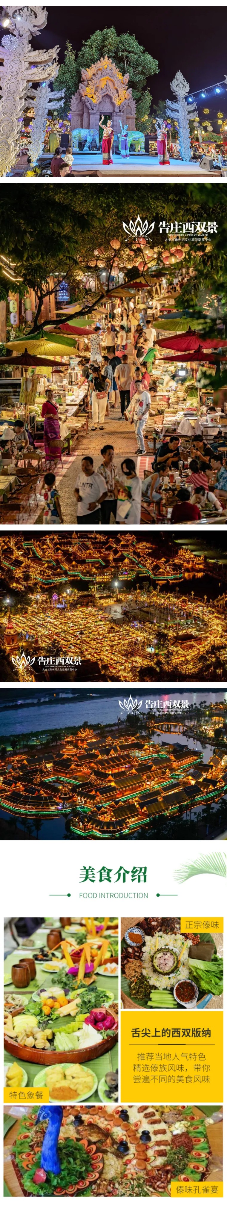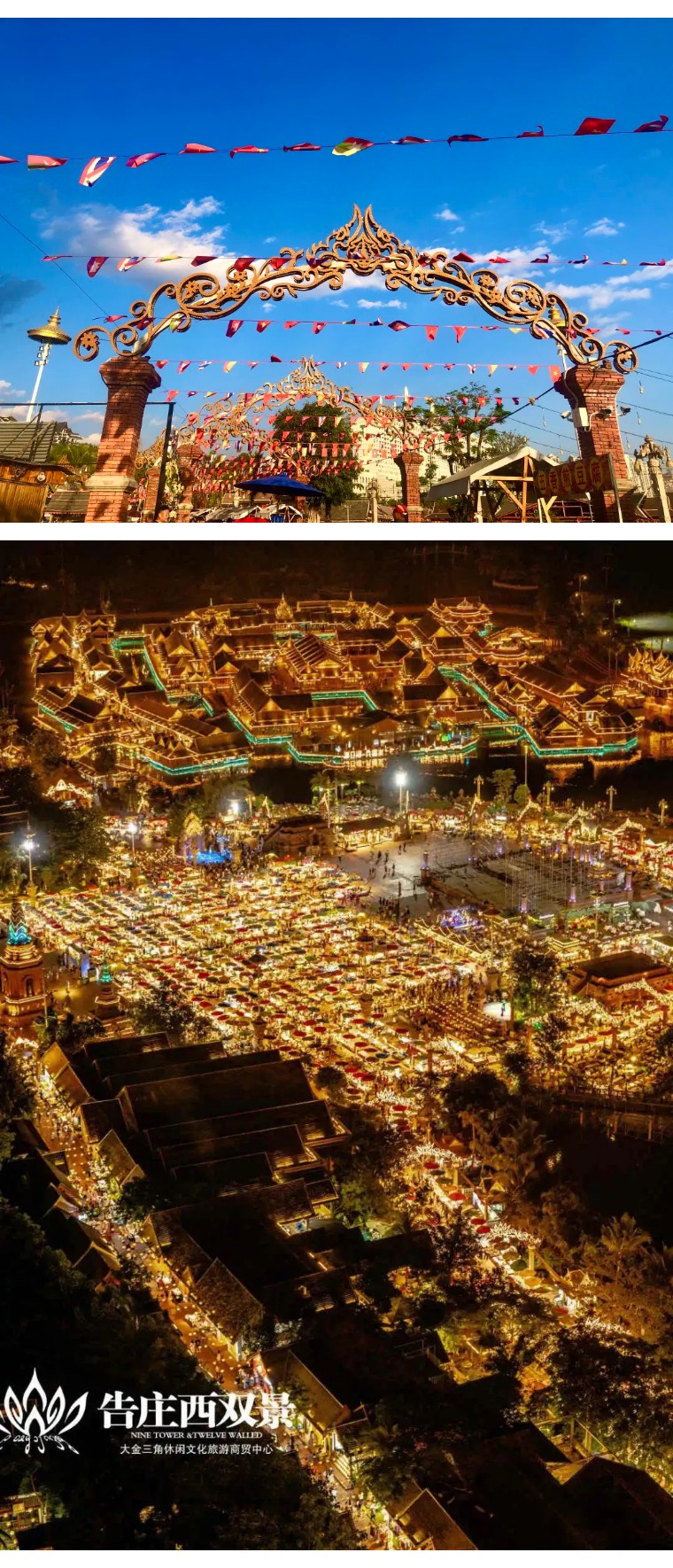 告庄西双景为傣语,汉意为“九塔十二寨”,旨在重现古时景洪盛景,打造一个繁华昌盛的“景洪城中之城”。