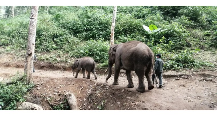 雨林牧象是野象谷内一项,跟随着工作人员来到一片静谧的森林里,和一大一小的两只象在森林里散步。既能参与到它们的生活里,又不会打扰到它们。