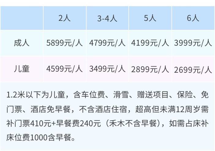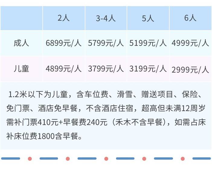 1.2米以下为儿童,含车位费、滑雪、赠送项目、保险、免门票、酒店免早餐,不含酒店住宿,超高但未满12周岁需补门票410元+早餐费240元(禾木不含早餐),如需占床补床位费1000(特价、正价团期)-1800(春节团期)含早餐。