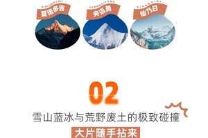 【行程概述】早餐后出发,途中会经过各大旅行博主的拍照圣地【康定机场彩虹公路】,这里背靠雅拉雪山,遥望贡嘎群山,分分钟拍出雪山公路大片,惊艳朋友圈。而后抵达一处秘境海子--【红海子(加呷腊)】,这里可以包揽整个湖泊和雪山。晴天,可以看到笔架山(5880M)、田海子峰(6080M)等一众雪山,拍照更是一绝,海子和雪山遥相呼应,怎么拍都好看。游玩后我们朝着甘孜藏族自治州首府——《康定情歌》中的康定行进,随后上【雅康高速】,穿越二郎山隧道,感受阴阳两重天,经雨城雅安上成雅高速返回成都。