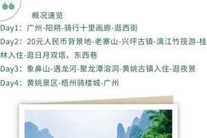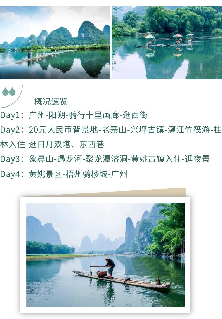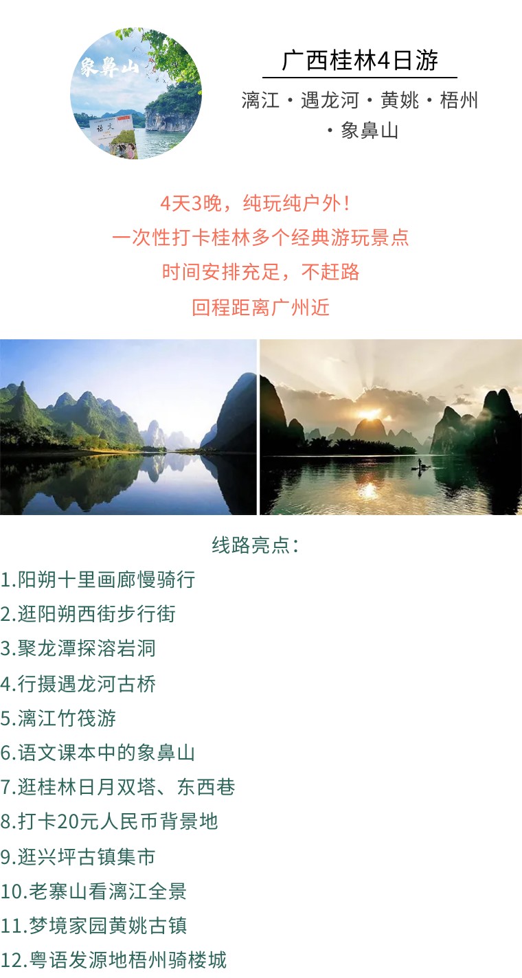5. 景点:阳朔骑行租单车费用、兴坪古镇、漓江4人竹筏票、象鼻山、遇龙河、聚龙潭溶洞门票、黄姚古镇、梧州。