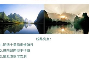 阳朔骑行,十里画廊风景区,全长10公里,基本覆盖了阳朔所有出名的景区,途经聚龙潭、蝴蝶泉、金水岩、大榕树、月亮山等。沿路奇峰美景,田园秀色,许多山岩形状独特给人遐想,如诗如画。十里画廊有许多小景特别有趣,坐汽车会一晃而过,最悠闲的方式莫过于骑一辆自行车,走走停停,观景拍照两不误。