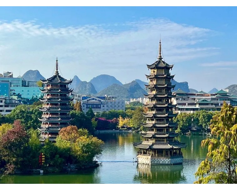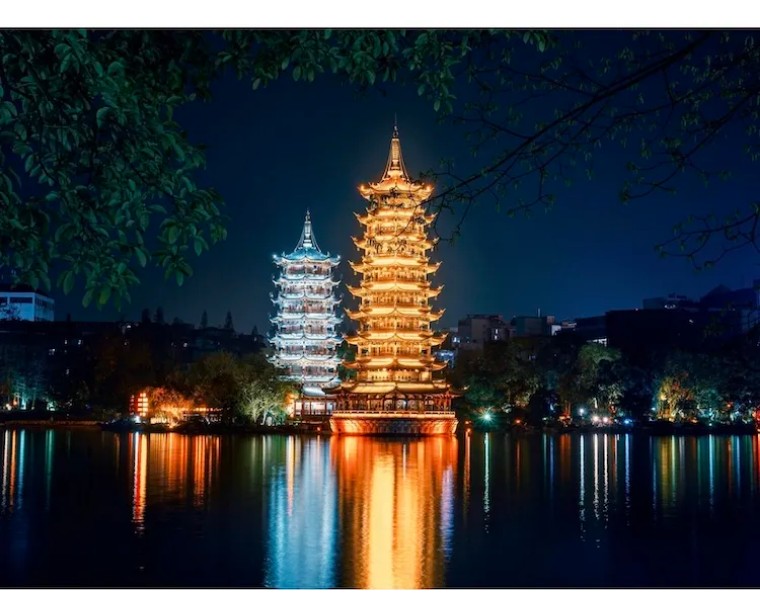 号称世界第一铜塔,地处桂林市中心区,是桂林旅游的一个绝美夜景观赏地。也是两江四湖环城水系中最著名的旅游景点。两塔之间以湖底一条10多米长的湖底隧道相连。