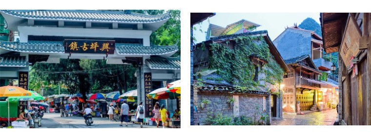 漓江上一颗璀璨的明珠,位于阳朔县东北部。20元人民币的背景地就是在兴坪。具有1700多年历史,各类砖瓦结构的古建筑大部分保存完好,古街的东南侧狮子旦为熙平县城遗址,城墙轮廓尚清,随处可见古砖瓦陶瓷残片,只是原来车马来往人看人的繁华县城,呈现出一派青山幽幽、村舍几座的肃静氛围。