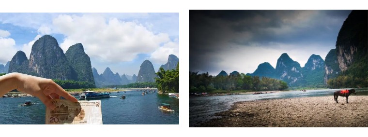 当你拿出一张20元人民币时,一眼就可以看出背面的山水图案取自兴坪风光。看镰刀湾上游方向,参差罗列的山峰倒映在碧清的江水之中,分明就是一幅巧夺天工的山水画。