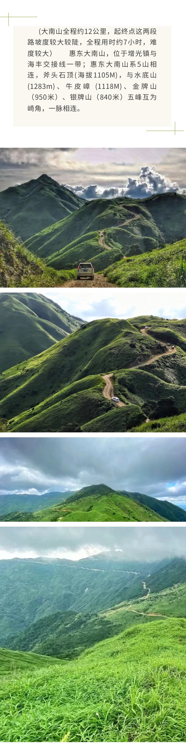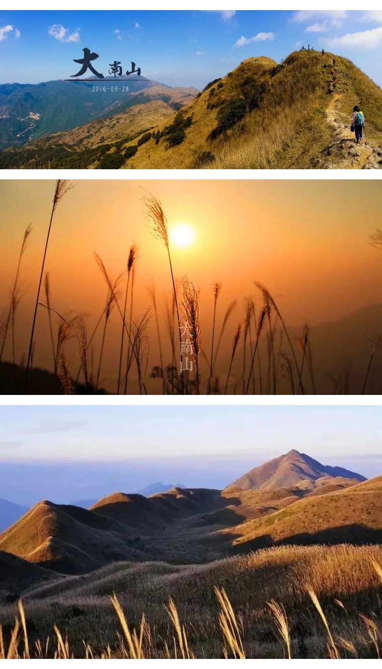大南山在海岸边上,山中可观海色,嶂顶可洗风尘。此处相隔两三公里以内,三峰互为崎角,一脉相连。走在山脊上,风光无限……有着武功山一样的高山草甸,有着船底顶一样的高原风光,人品好的话还可以看到令人震撼的云海哦,可谓风光无限。