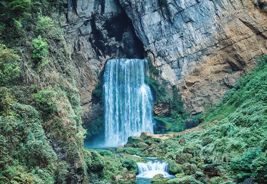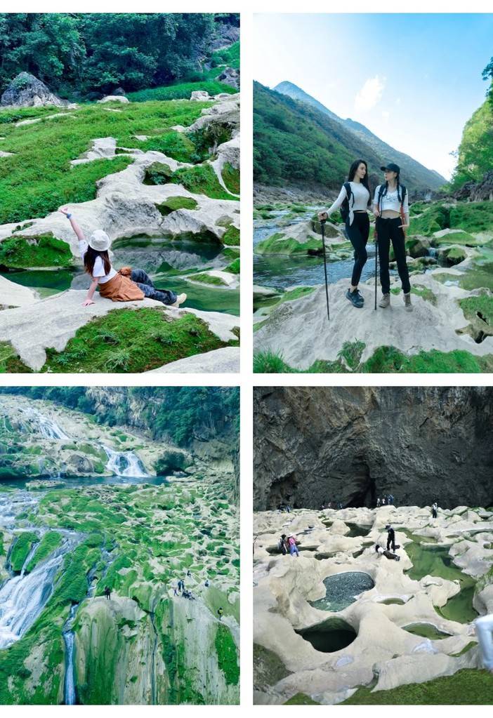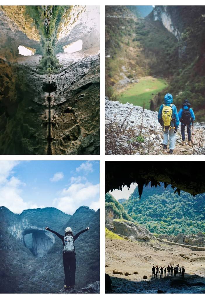 下午走出溶洞继续翻越天坑谷地、乱石坡、灌木林前往第二处地下河、看大圣之眼、探密牛倒岩洞中瀑布、凹造型拍美照、看穿洞,随后出山沿乡道返回起点,乘车前往安顺市区入住酒店,结束当天的徒步行程。