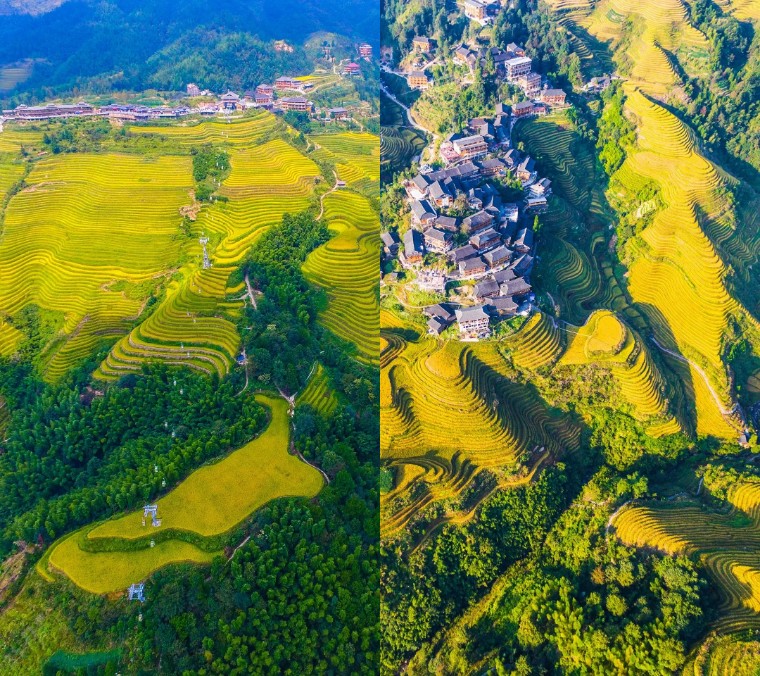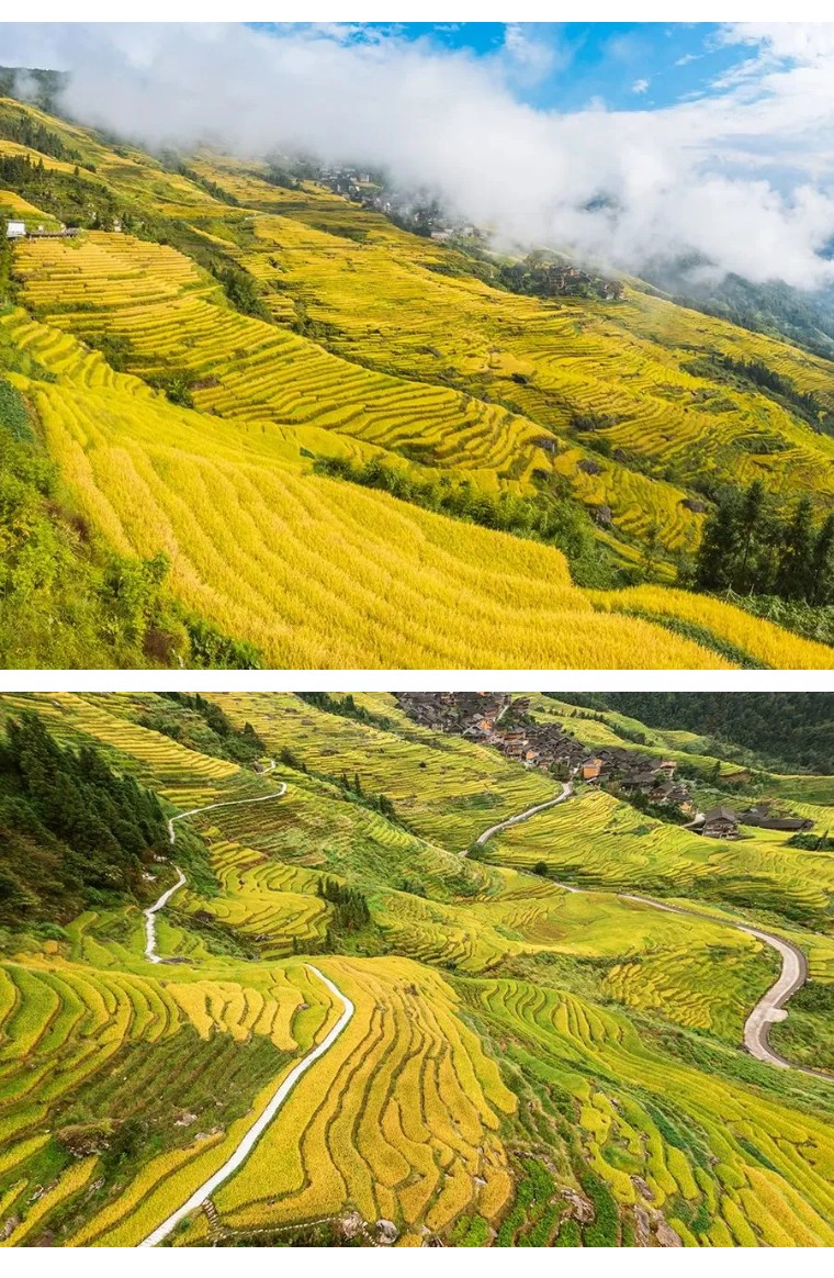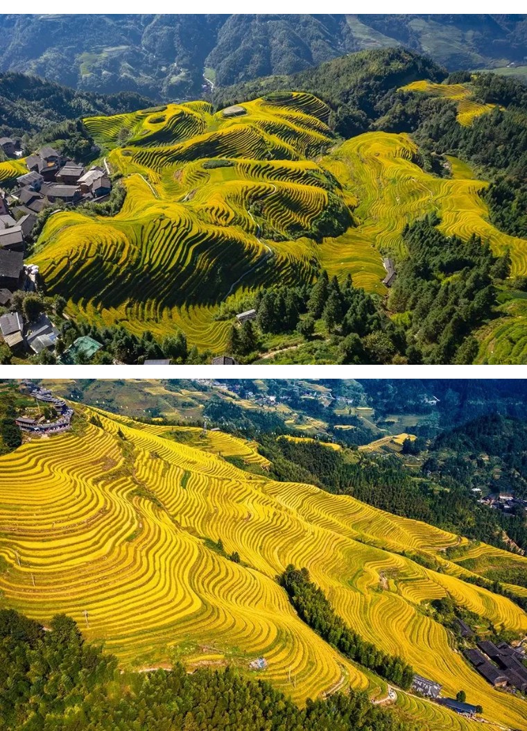 古壮寨的梯田9月中旬已成熟,最早进入金黄色的梯田