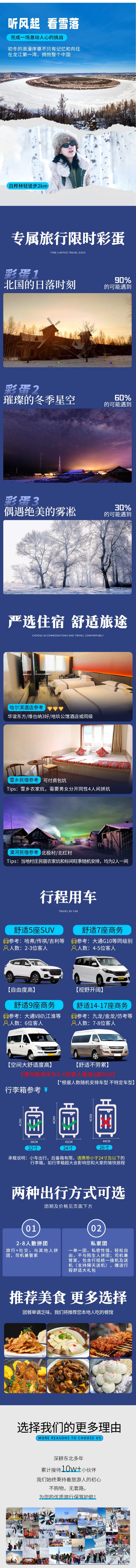 1、住宿:北红村家庭农家炕双人标间(独立卫浴)1晚、北极村家庭旅馆或农家炕双人标间(独立卫浴)1晚、哈尔滨3钻酒店标间1晚,雪乡4人间独立卫浴农家炕1晚(男女分开4人间拼炕)