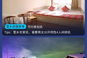 春节团期:漠河段2晚住宿补300元/人,补1晚哈尔滨住宿350元/人,1晚农家炕如想单住请现询客服;