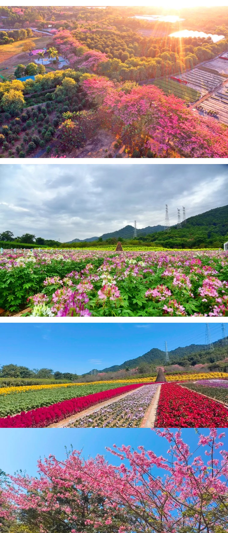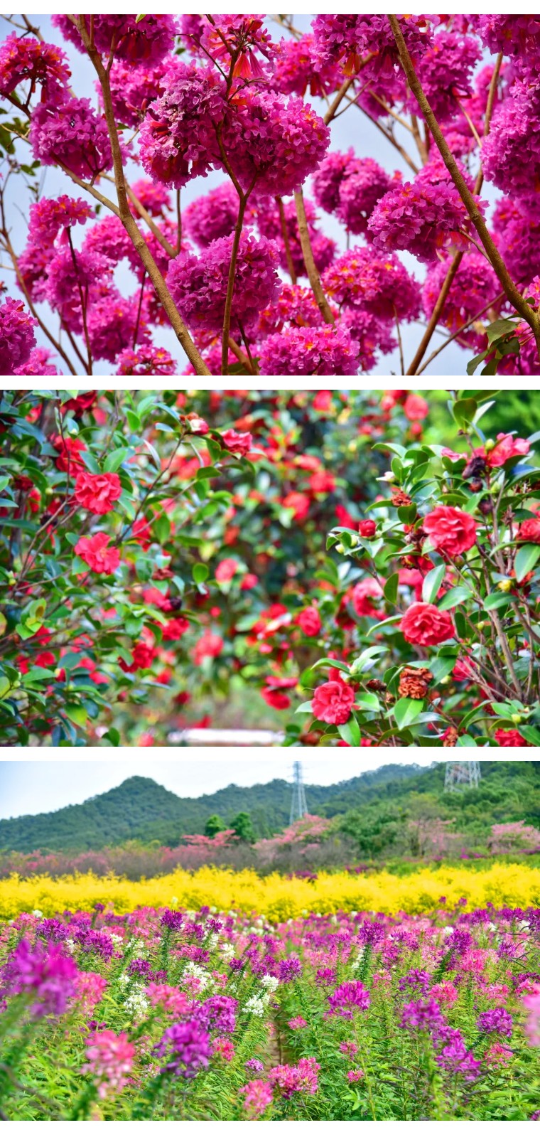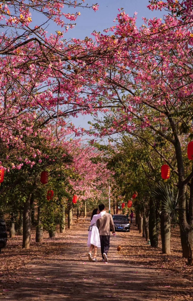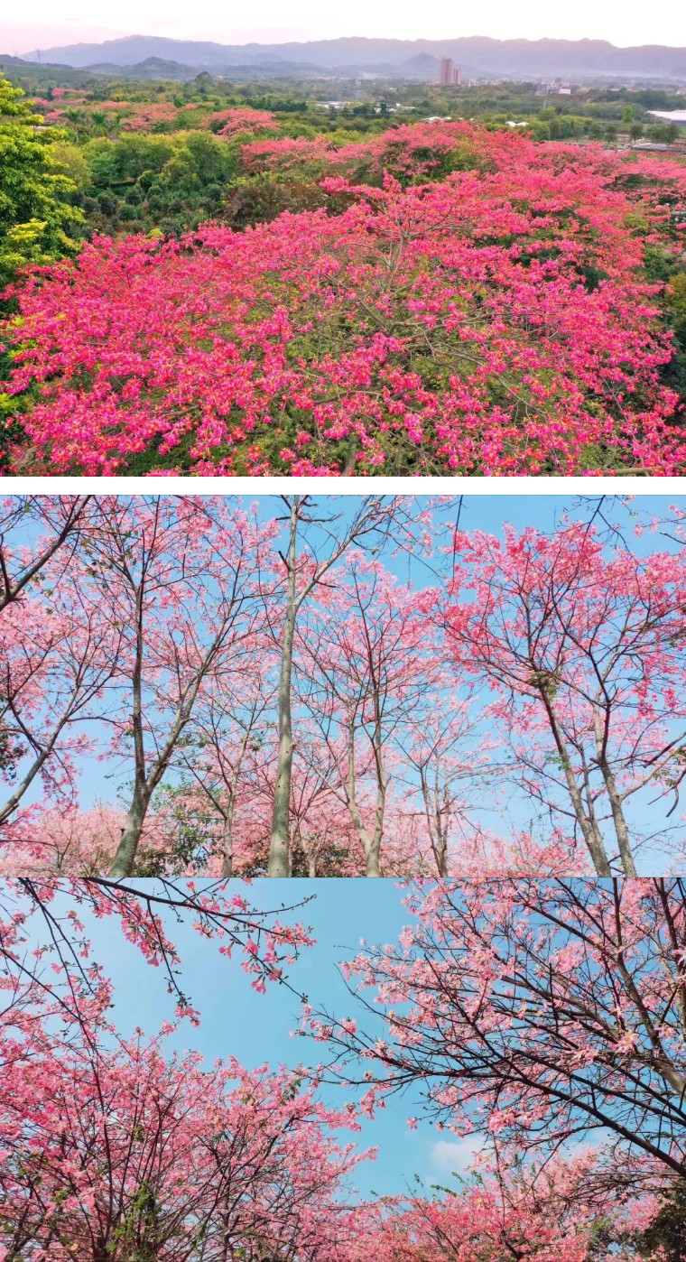 还种植了紫花风铃,以及3万株茶花艳压枝头,醉蝶花铺就七彩花毯,美丽异木棉如云似霞,色彩顺着花田绵延至远山,将“阳光裹着花香”的诗意场景具象呈现。