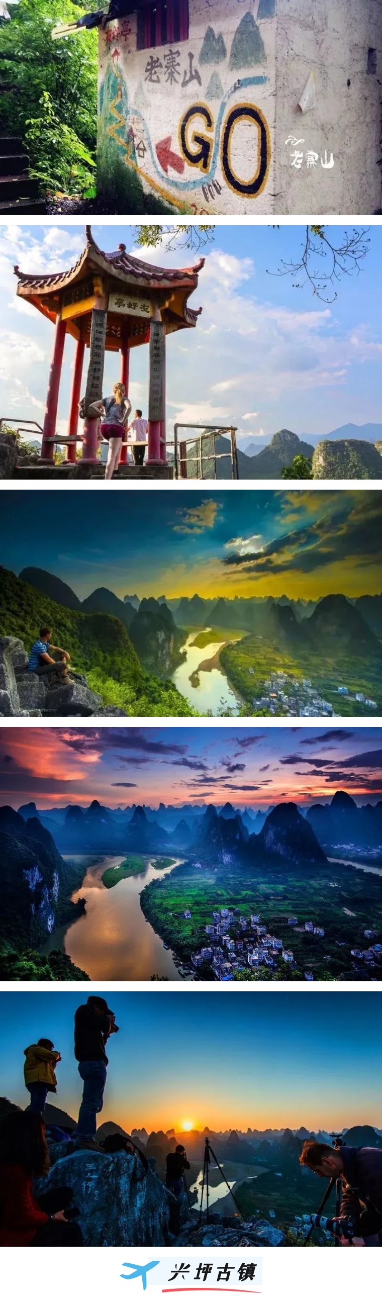 13:30 在古镇游玩,打卡古戏台,爬老寨山(阶梯路,单程约30分钟路程),登上老寨山,可俯瞰漓江大拐湾和兴坪古镇全景。或不登老寨山的小伙伴可闲逛兴坪古镇,徒步漓江精华段,依次经过兴坪古镇-二十元人民币背景地-九马画山等;还可以自费乘坐竹筏游漓江,也可以乘坐电瓶车前往九马画山(漓江竹筏比较多人,具体可以看情况自由选择是否乘坐);