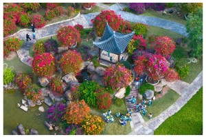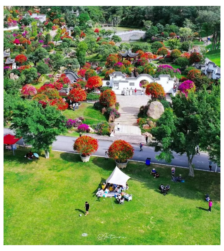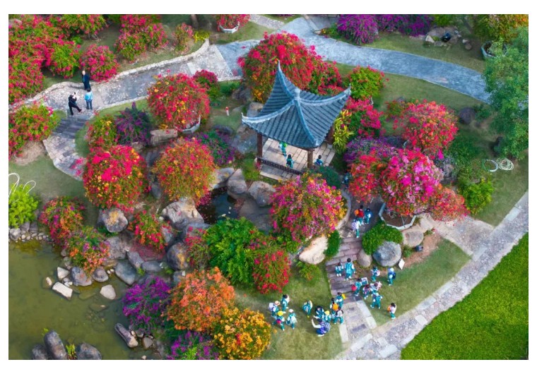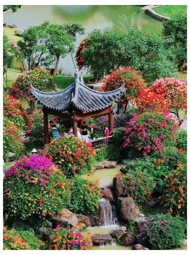 园内建筑古典雅致,亭台楼阁移步易景,与花卉景观相得益彰 。有80年以上树龄的五雀三角树嫁接五颜六色的三角梅,形成独特花海,颜色多样,姿态各异 。