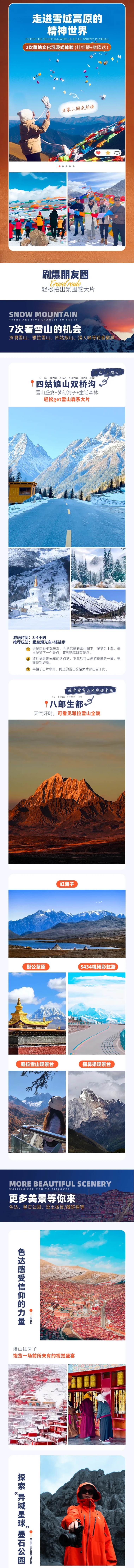 【行程概述】早晨乘车从成都出发,经闻名天下的"雨城"雅安,上雅康高速,穿越【二郎山隧道】,感受阴阳两重天,下高速便抵达甘孜藏族自治州首府--《康定情歌》中的康定。继续行车,拐进绝美的S434,这条路人少、景美,一路都是惊喜,蓝天、雪山、海子尽收眼底。而后抵达一处秘境海子--【红海子(加呷腊)】,这里可以包揽整个湖泊和雪山。晴天,可以看到笔架山(5880M)、田海子峰(6080M)等一众雪山,拍照更是一绝,海子和雪山遥相呼应,怎么拍都好看。游玩后我们朝着康定机场的方向出发,途中经过各大旅行博主的拍照圣地【康定机场彩虹公路】,这里背靠雅拉雪山,遥望贡嘎群山,分分钟拍出雪山公路大片,惊艳朋友圈。拍摄完毕后前往【八郎生都】,这个近年来非常火爆的360°天然雪山观景台,天气好时,可以看见【雅拉雪山】全貌,在这里随手一拍,皆是大片!山顶的秋千、废弃房车更是网红拍照打卡地,如果有幸遇见日落时分的绝美夕阳,那将是终生难忘的记忆!随后前往塔公镇入住。