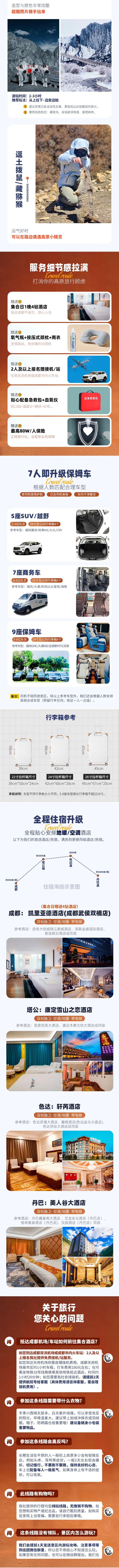 (1)以上行程时间安排可能会因天气、路况等原因做相应整,正常情况下完团回到成都时间为晚上19:00-20:00,如果必须当日离开,请定23:00以后的回程大交通,以免耽误行程,敬请谅解;