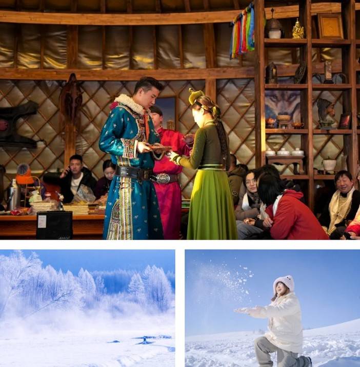 午餐后,我们到达【游牧体验园】,在这里可以放肆开玩,体验雪地爬犁冲浪、高山滑雪圈,参加蒙古族祭火大典,在暖喝的蒙古包内与热情蒙古人学蒙语、跳蒙古舞,观看群狼夺肉、马头琴表演,喂食草原精灵梅花鹿,品尝下马酒、奶皮子、奶豆腐,全方位感受蒙古族风情。