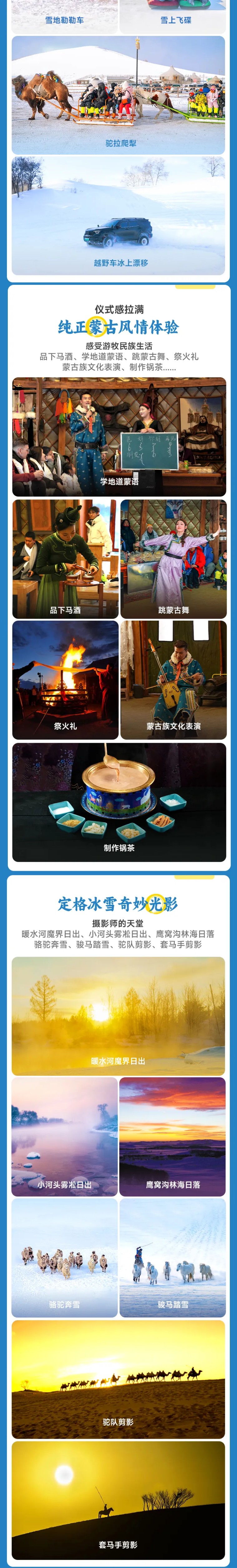 午餐后,我们到达【游牧体验园】,在这里可以放肆开玩,体验雪地爬犁冲浪、高山滑雪圈,参加蒙古族祭火大典,在暖喝的蒙古包内与热情蒙古人学蒙语、跳蒙古舞,观看群狼夺肉、马头琴表演,喂食草原精灵梅花鹿,品尝下马酒、奶皮子、奶豆腐,全方位感受蒙古族风情。