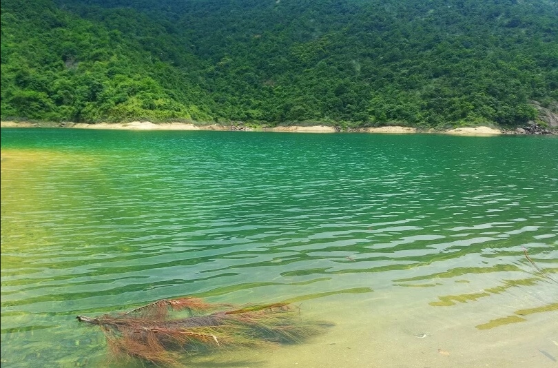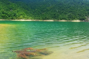 沿着山脊下山,半山腰间竟藏这一个“小绿湖”,蔚蓝的天空和湖面完美的相融在一起,让人不愿继续前行。坐在湖边小石上歇歇脚,望着平静的湖面,静静地发个呆,感受那水汽的山风吹拂在脸上,一路跋涉的劳累顿时烟消云散。