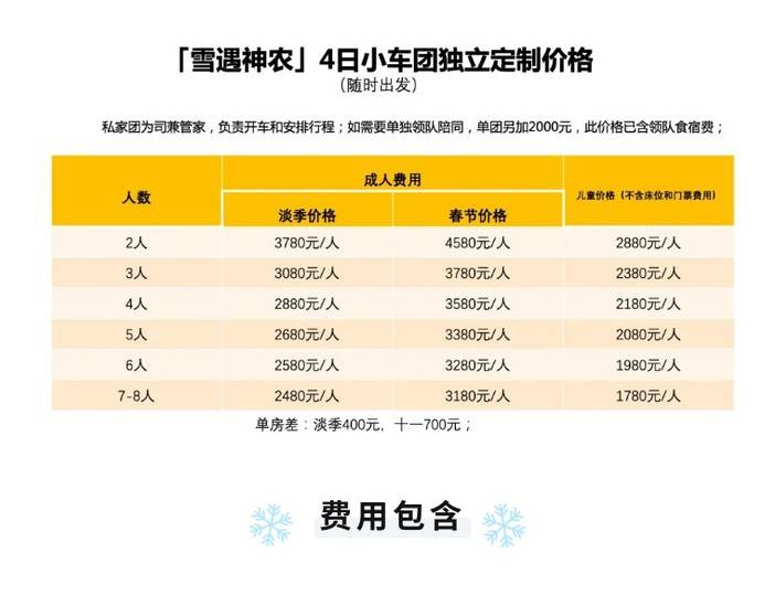 3.个性化消费,比如神农架滑雪雪服租赁35-100元一套、头盔20元一个、滑雪手套16元一个、寄存柜25元一个、滑雪眼镜30元一副等,另外不含滑雪专业教练费用(根据人数定价);我们滑雪包含的是双板或单板全天滑雪,如果需要中途换板,多出来费用自行支付;
