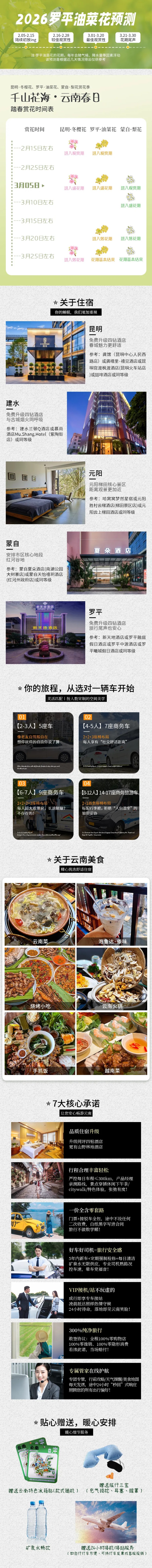 1、住宿:昆明1晚四钻酒店(参考:龚禧里禧见酒店或昆明官渡枫渡酒店(昆明火车站店)或龚馆酒店或同等级),罗平1晚四钻酒店(参考:新天地酒店或罗平融庭假日酒店或罗平中源酒店或罗平曦城假日酒店或同等级),建水1晚四钻酒店(参考:建水兰顿Q酒店或慕尚酒店Mu.Shang.Hotel(紫陶街店)或同等级),元阳1晚三钻酒店/民宿(参考:哈窝窝梦然星宿或元阳胜村云梯酒店(梯田景区店)或元阳云上梯田酒店或同等级),蒙自1晚三钻酒店(参考:蒙自夏朵酒店(南湖公园大树寨店)或蒙自天怡禧玥酒店(红河州政府店)或同等级);