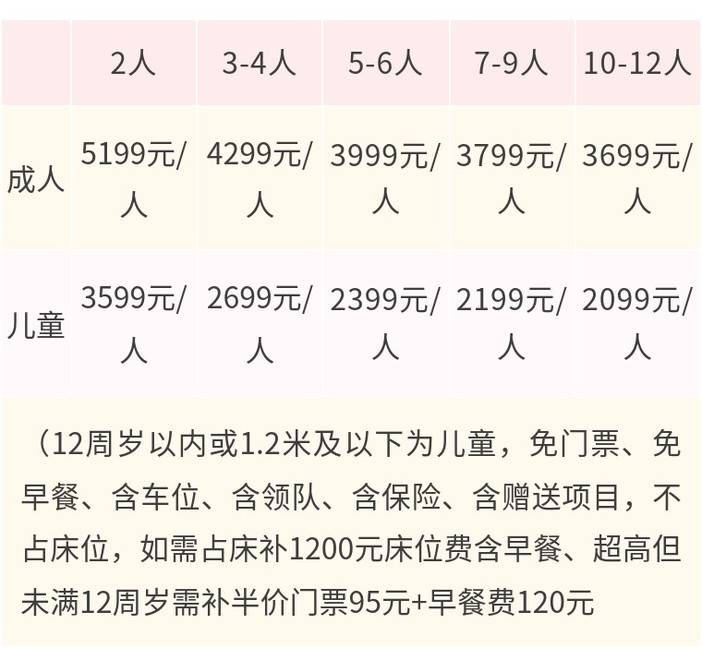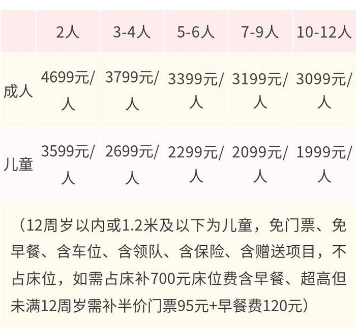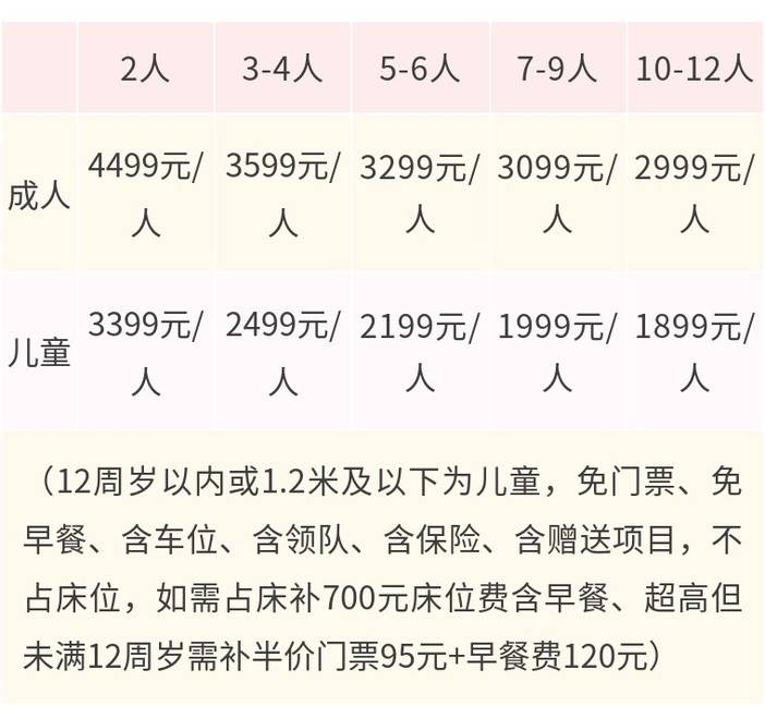 l 1.2米及12周岁以下为儿童,免门票、免早餐、含车位、含领队、含保险、含赠送项目、不占床位;